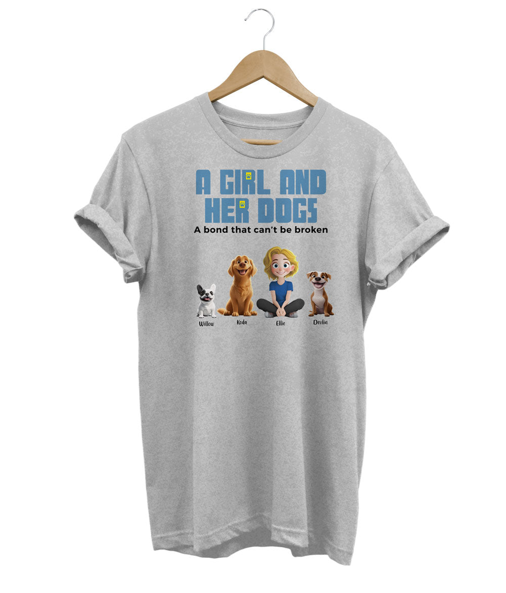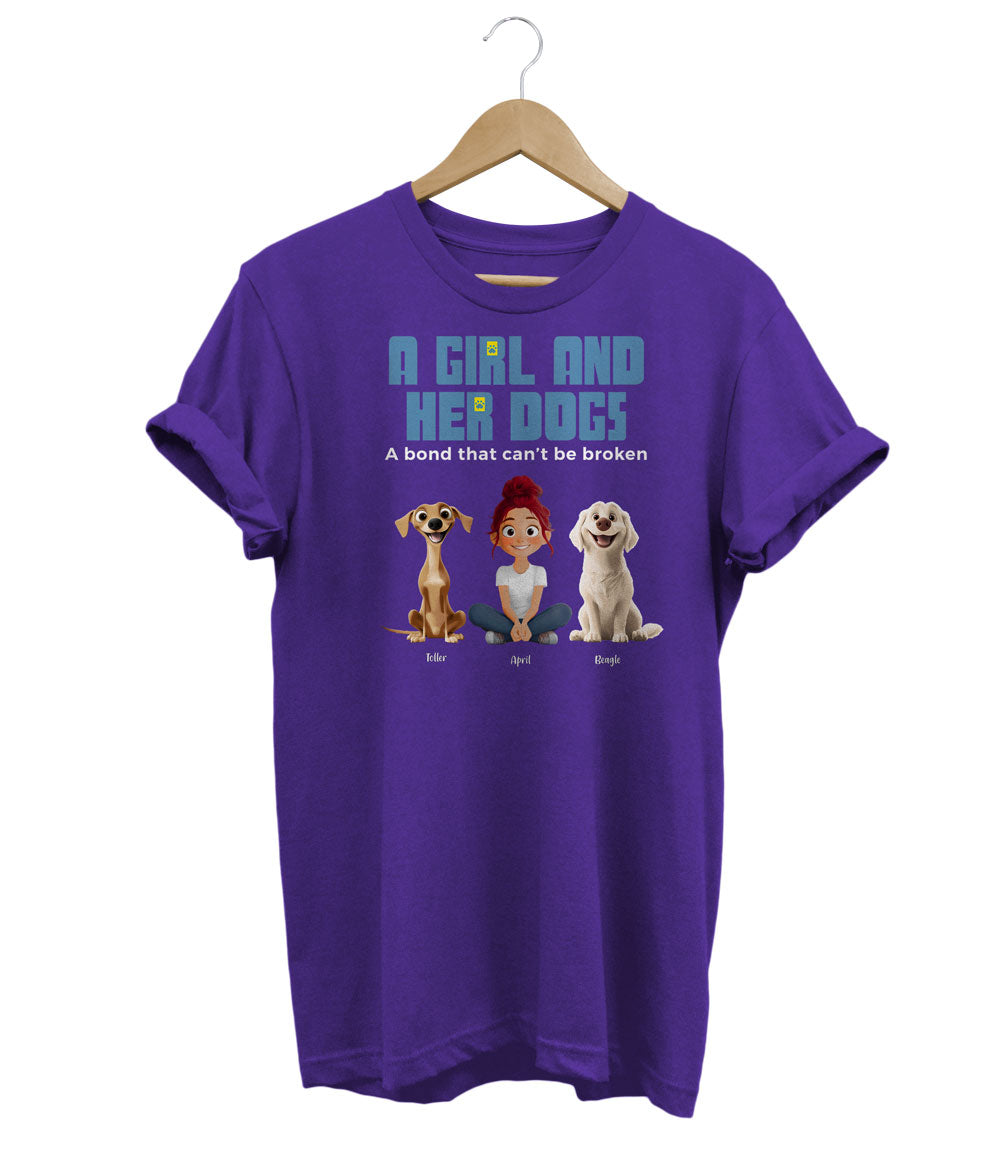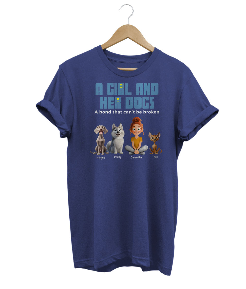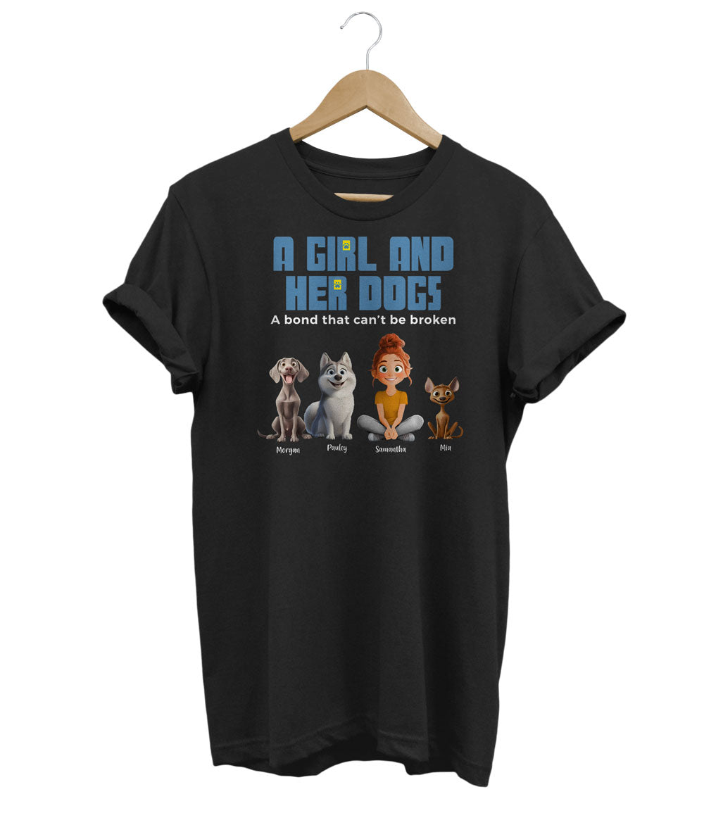 Celebrate your bond with your furry companions with this custom t-shirt! Personalize it with up to 5 of your dogs' names on the sleeve, creating a unique and heartwarming tribute to your beloved pets.